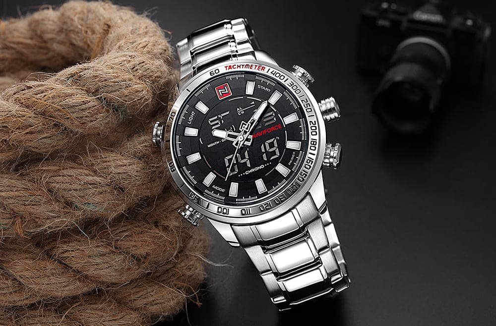 ساعة يد نافي فورس Naviforce NF9093 S B W رجالي أصلية موديل ( NF9093 ) نظرية و رقمية بلون مينا اسود و استيك معدن بلون فضي احصل عليها غدا خلال 24 ساعة داخل القاهرة و الجيزة و الاسكندرية