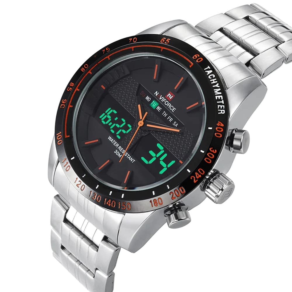 ساعة يد نافي فورس Naviforce NF9024 S B O رجالي أصلية موديل ( NF9024 ) نظرية و رقمية بلون مينا اسود و استيك معدن بلون فضي احصل عليها غدا خلال 24 ساعة داخل القاهرة و الجيزة و الاسكندرية