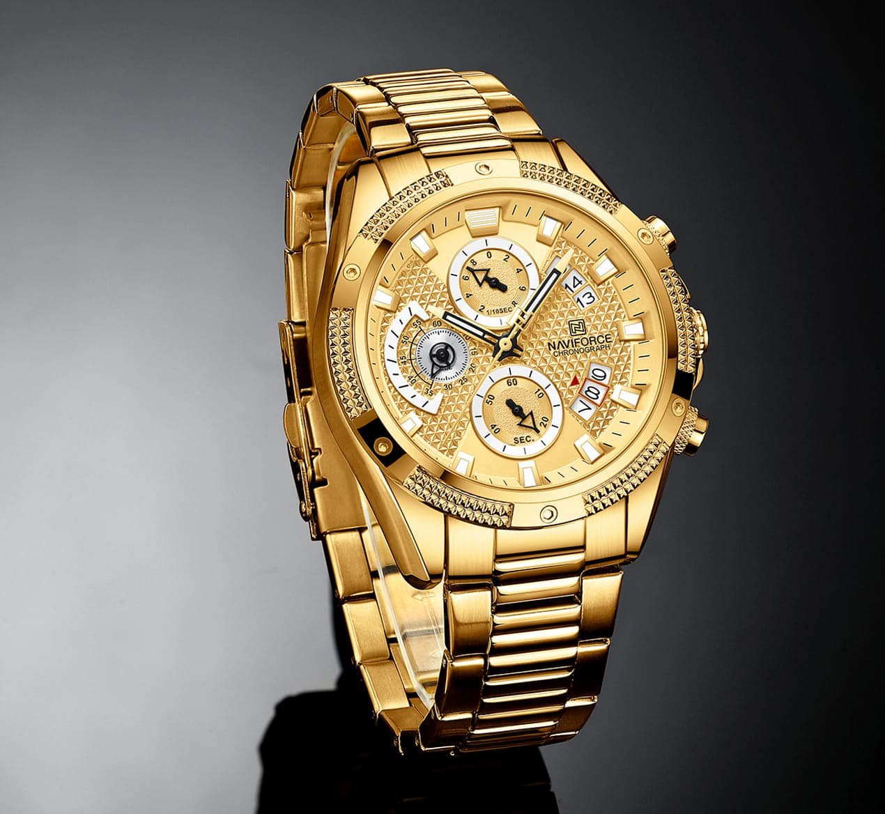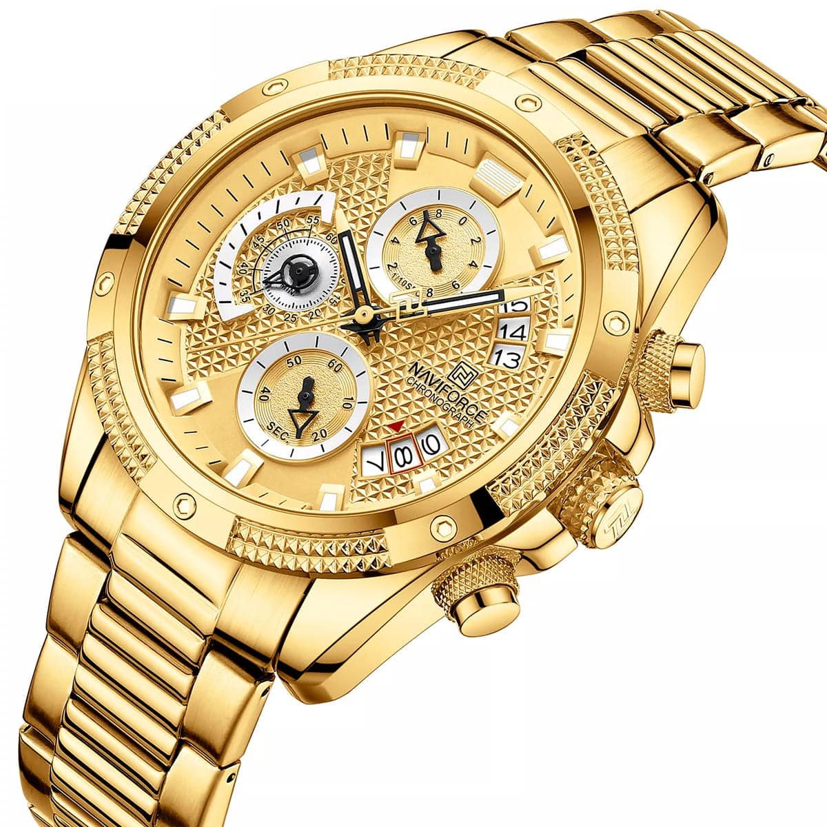 ساعة يد نافي فورس Naviforce NF8021 G G رجالي أصلية موديل ( NF8021 ) نظرية بلون مينا ذهبي و استيك معدن بلون ذهبي احصل عليها غدا خلال 24 ساعة داخل القاهرة و الجيزة و الاسكندرية