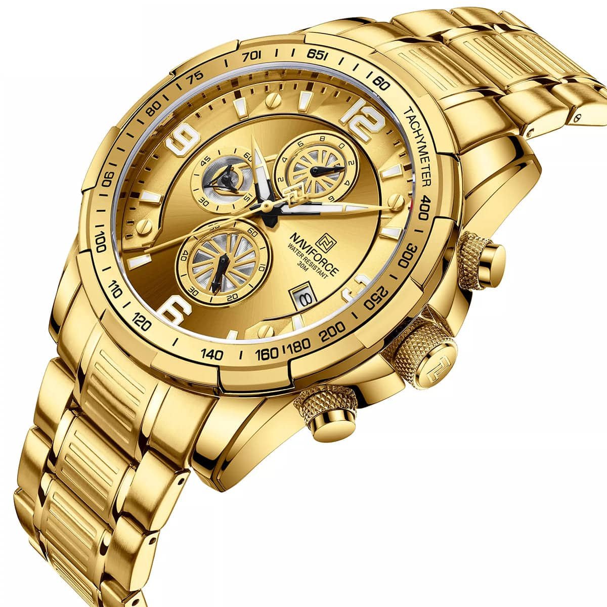 ساعة يد نافي فورس Naviforce NF8020S G G رجالي أصلية موديل ( NF8020S ) نظرية بلون مينا ذهبي و استيك معدن بلون ذهبي احصل عليها غدا خلال 24 ساعة داخل القاهرة و الجيزة و الاسكندرية