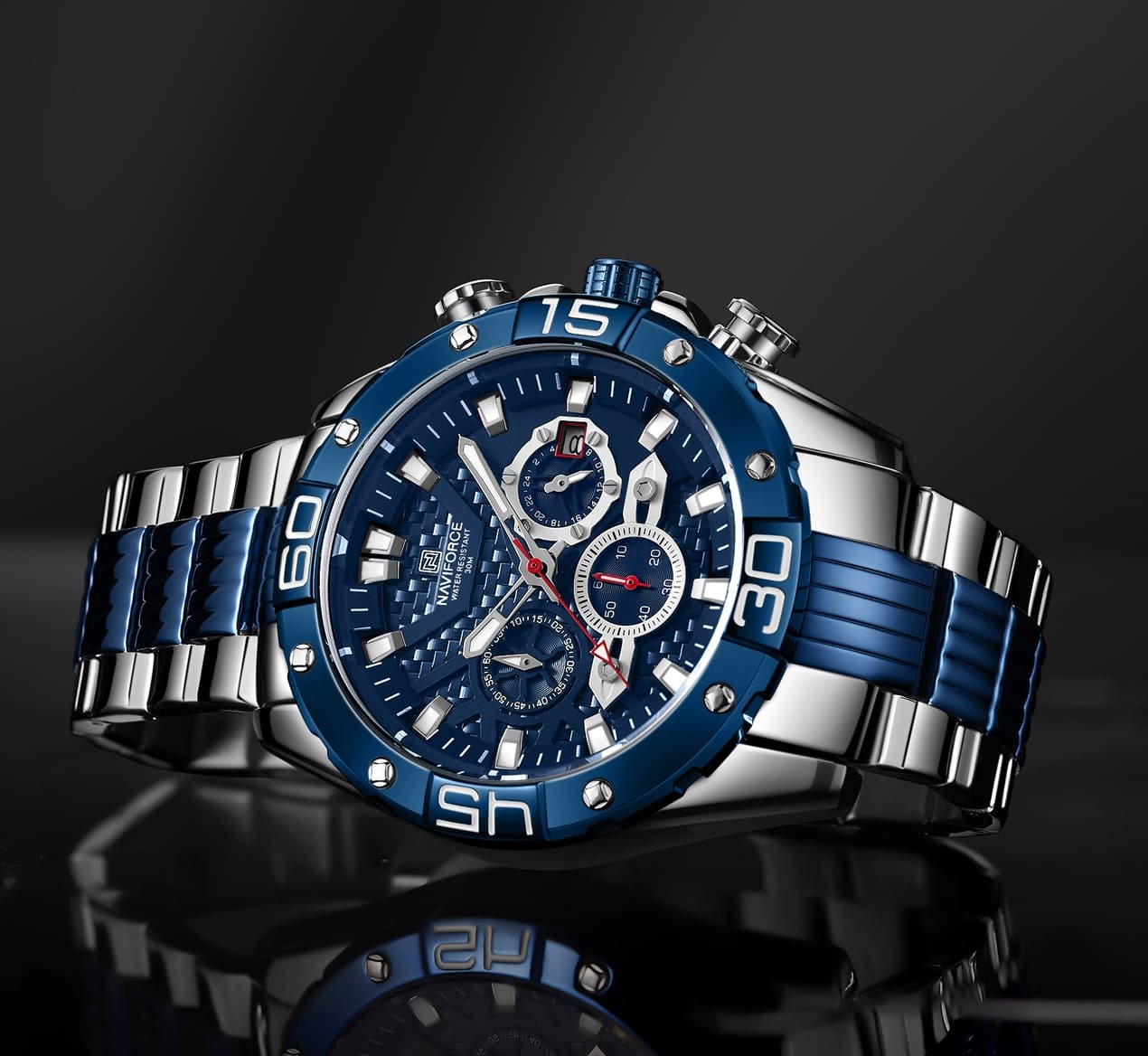 ساعة يد نافي فورس Naviforce NF8019S S BE رجالي أصلية موديل ( NF8019S ) نظرية بلون مينا ازرق و استيك معدن بلون فضي و ازرق احصل عليها غدا خلال 24 ساعة داخل القاهرة و الجيزة و الاسكندرية