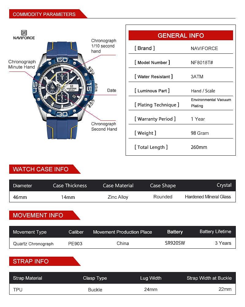 ساعة يد نافي فورس Naviforce NF8018T S BE Y رجالي أصلية موديل ( NF8018T ) نظرية بلون مينا ازرق و استيك سيليكون مطاط بلون ازرق احصل عليها غدا خلال 24 ساعة داخل القاهرة و الجيزة و الاسكندرية