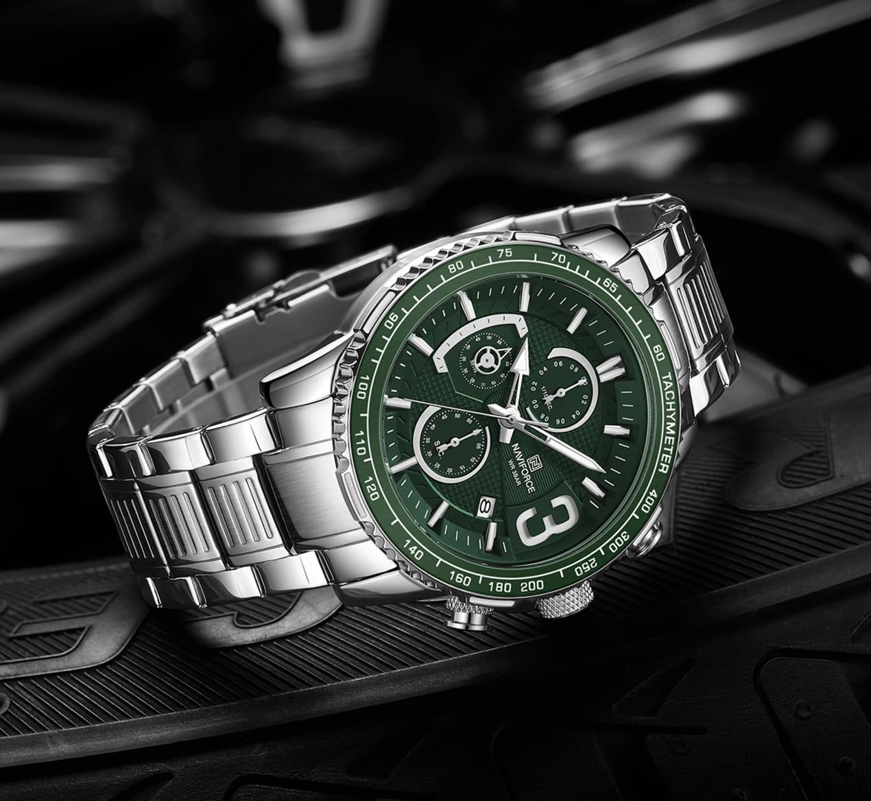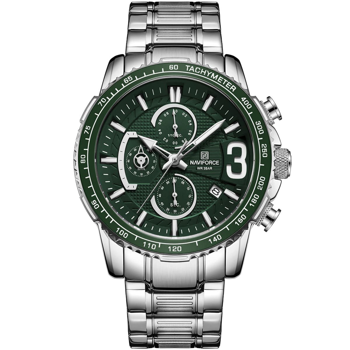 ساعة يد نافي فورس Naviforce NF8017 S GN رجالي أصلية موديل ( NF8017 ) نظرية بلون مينا اخضر و استيك معدن بلون فضي احصل عليها غدا خلال 24 ساعة داخل القاهرة و الجيزة و الاسكندرية