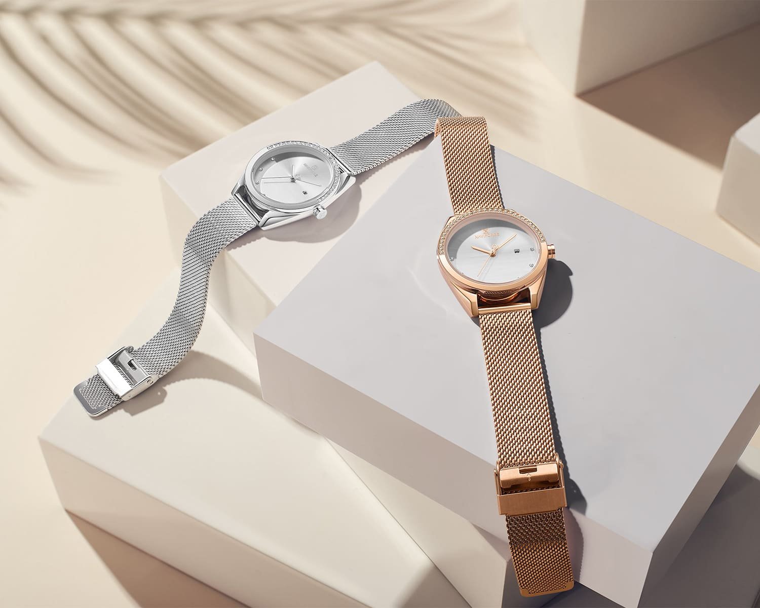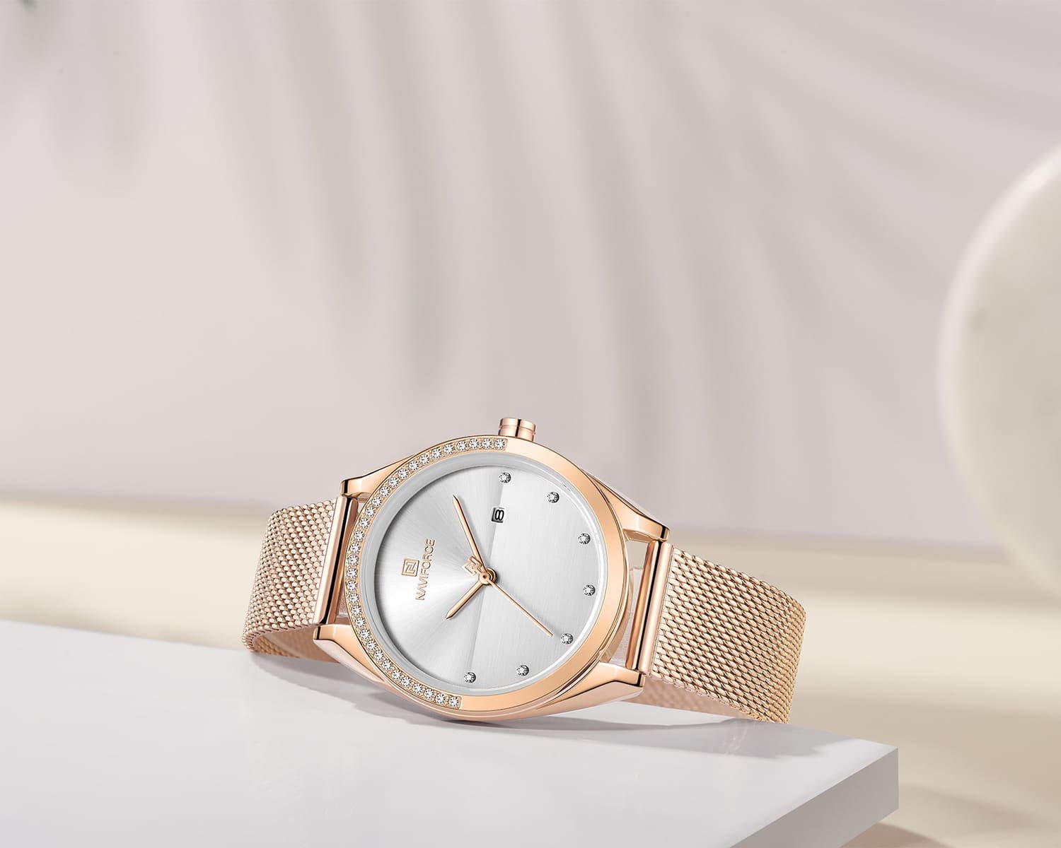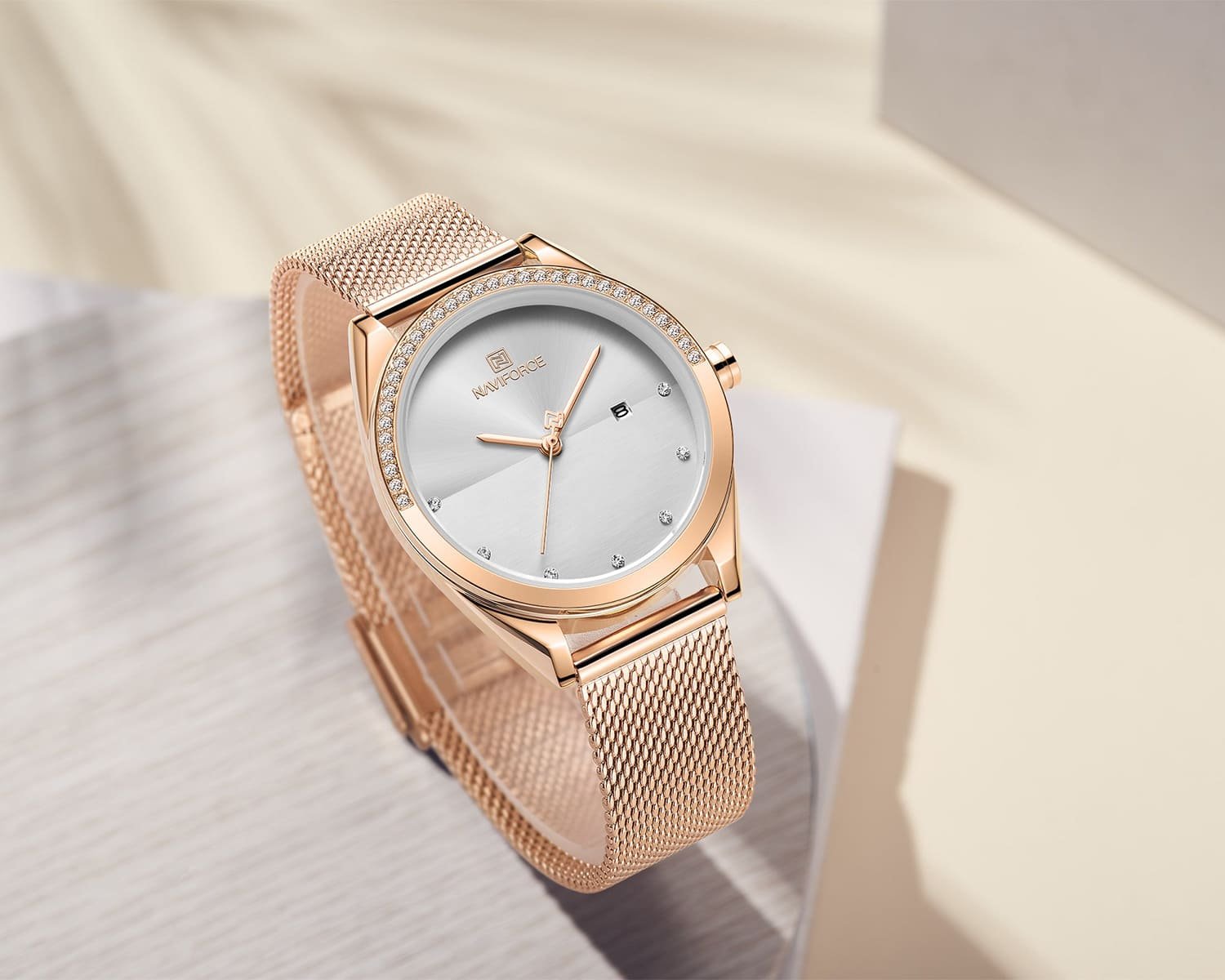 ساعة يد نافي فورس Naviforce NF5015 RG W حريمي أصلية موديل ( NF5015 ) نظرية بلون مينا ابيض و استيك معدن بلون نحاسي احصل عليها غدا خلال 24 ساعة داخل القاهرة و الجيزة و الاسكندرية