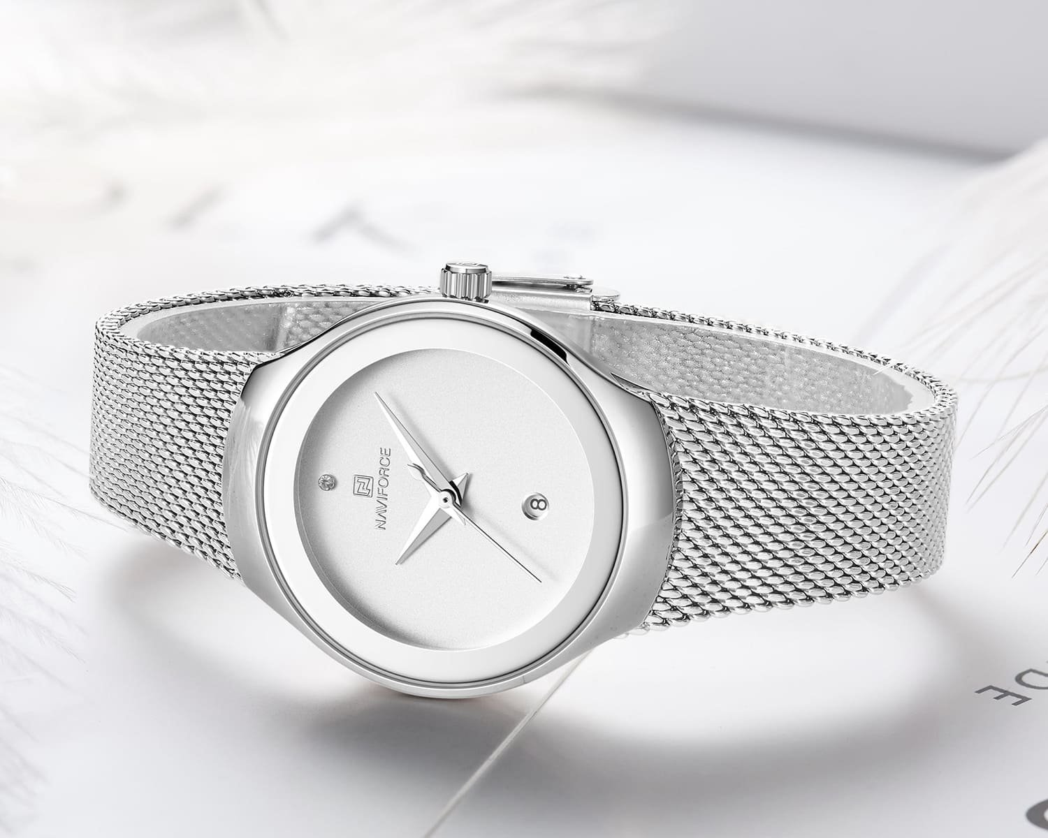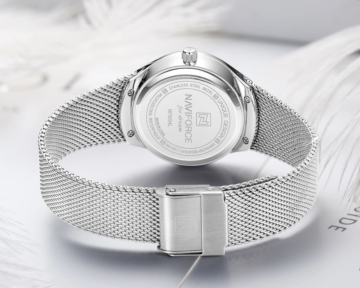 ساعة يد نافي فورس Naviforce NF5004 S W حريمي أصلية موديل ( NF5004 ) نظرية بلون مينا ابيض و استيك معدن بلون فضي احصل عليها غدا خلال 24 ساعة داخل القاهرة و الجيزة و الاسكندرية