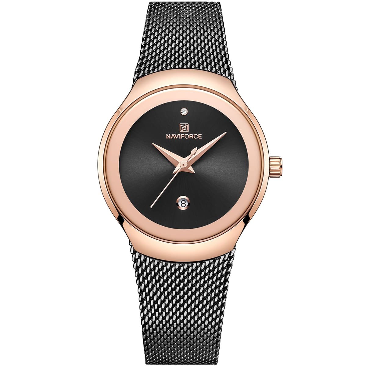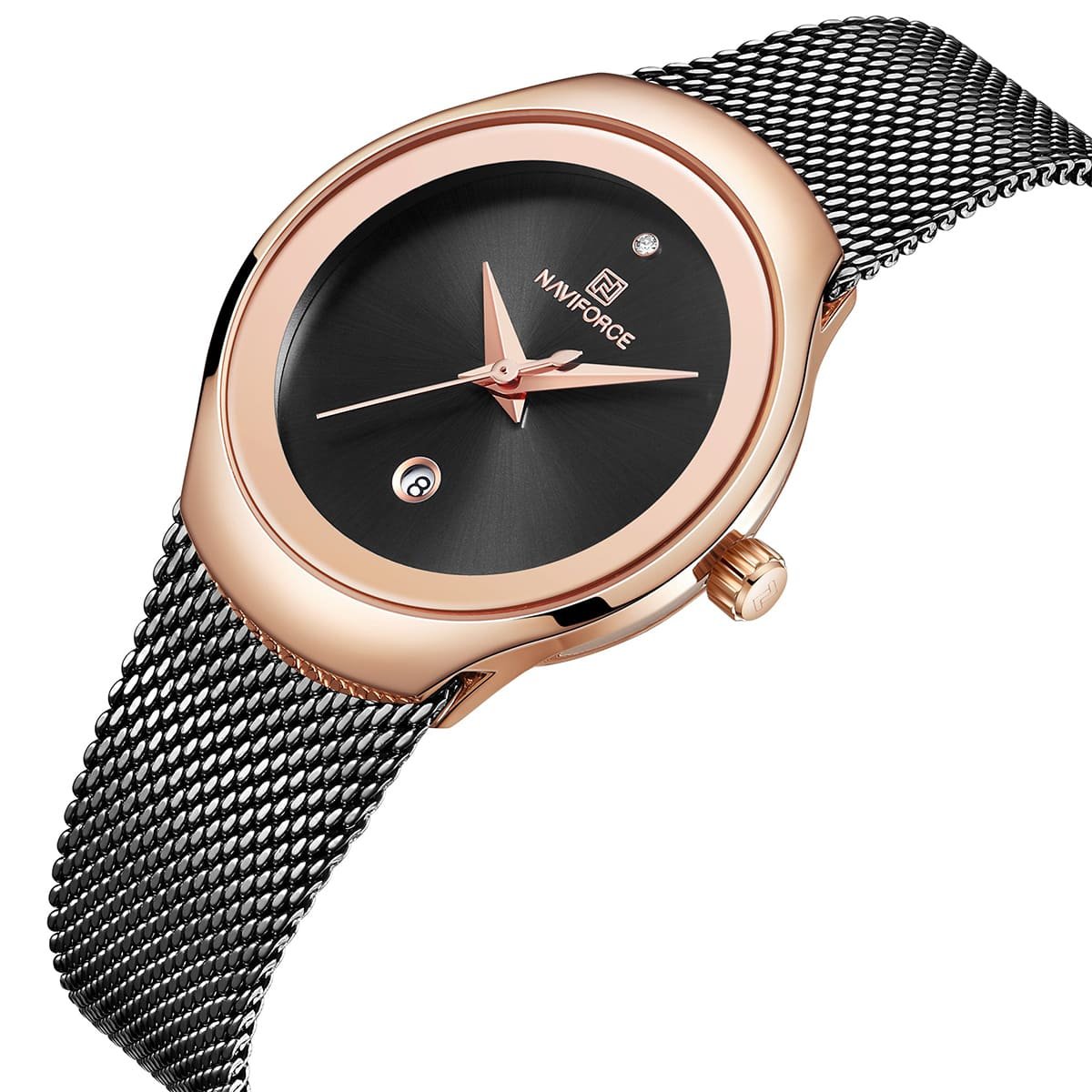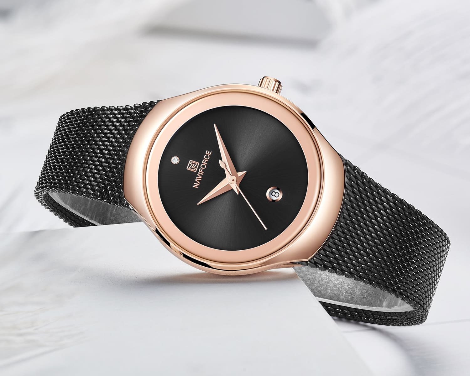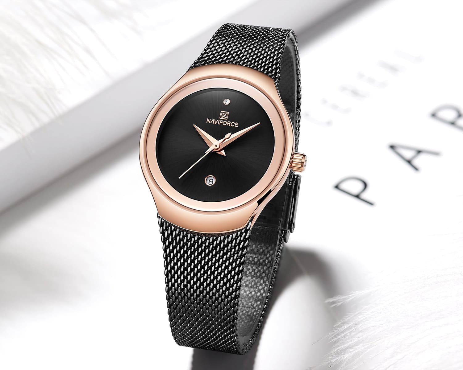 ساعة يد نافي فورس Naviforce NF5004 RG B حريمي أصلية موديل ( NF5004 ) نظرية بلون مينا اسود و استيك معدن بلون اسود احصل عليها غدا خلال 24 ساعة داخل القاهرة و الجيزة و الاسكندرية