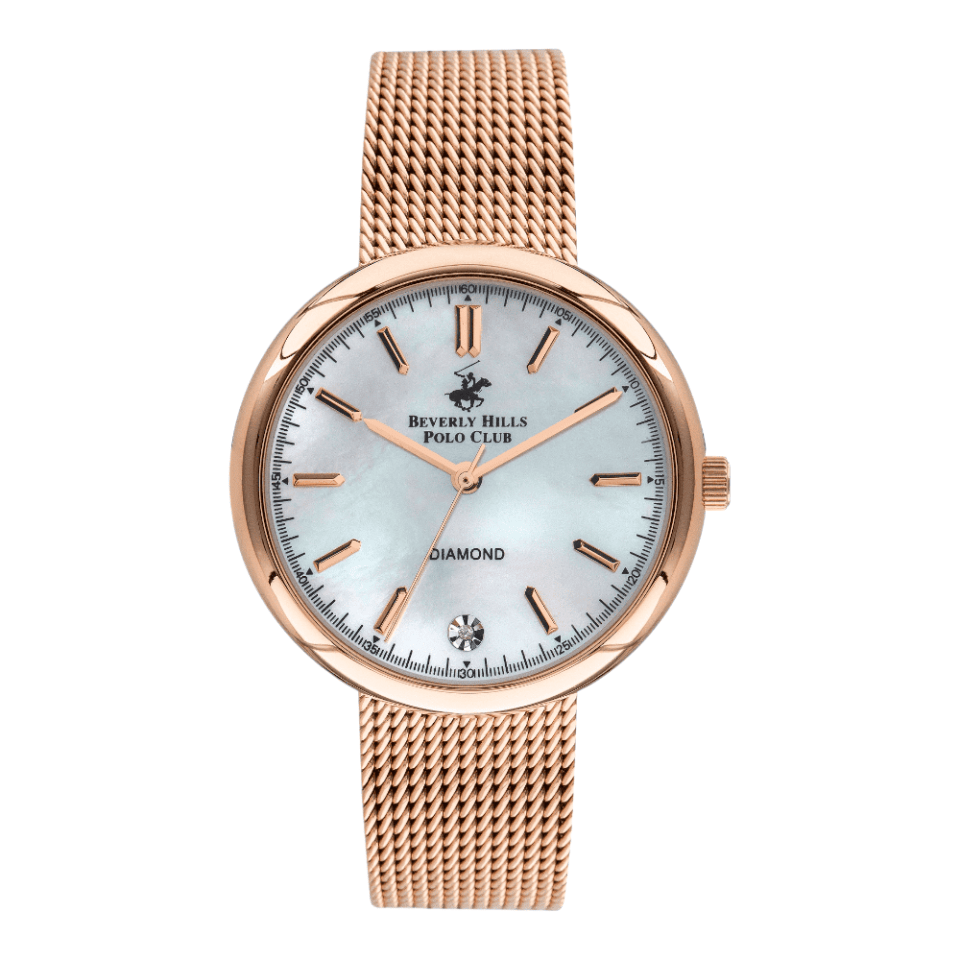 DescriptionInspired by both the luxury and heritage, The Beverly Hills Polo Club Watch with Metal case with Analog display, White Mop Dial 34 mm case diameter, Y120 movement, 5 ATM water resistant Rose Gold Metal bracelet with Standard BuckleRelated