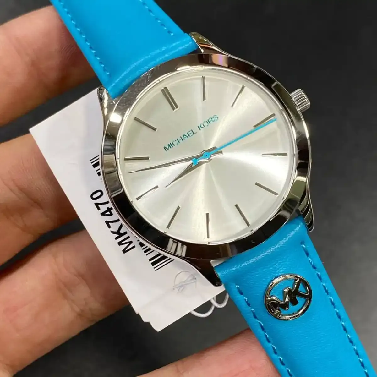 ساعة مايكل كورس Michael Kors للنساء أصلية موديل MK7470 لون ابيض و استيك جلد لون ازرق.