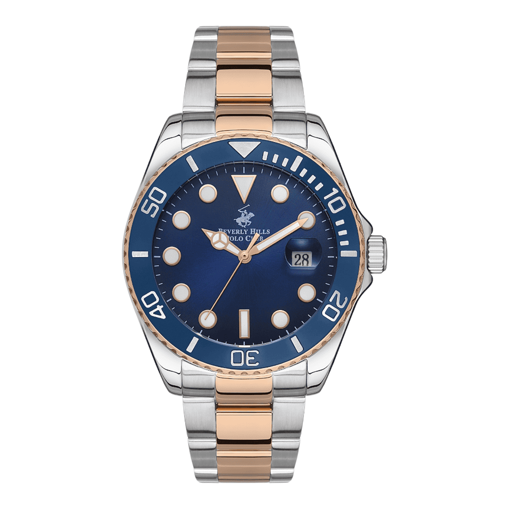 DescriptionInspired by both the luxury and heritage, The Beverly Hills Polo Club Watch with Metal case with Analog display, Dark Blue Dial 42.5 mm case diameter, 2315 movement, 10 ATM water resistant Silver / Rose Gold Metal bracelet with Standard BuckleRelated