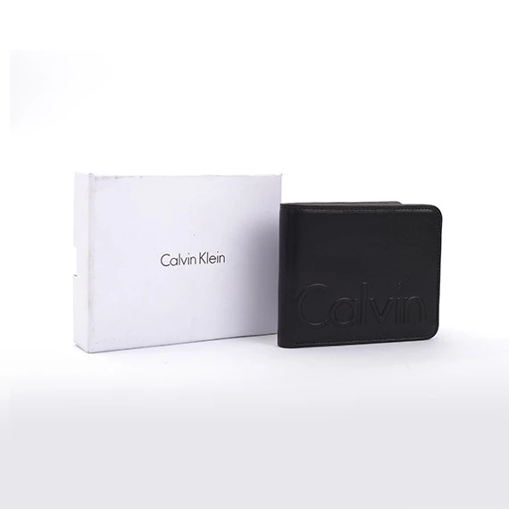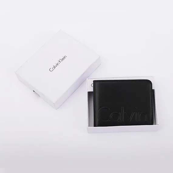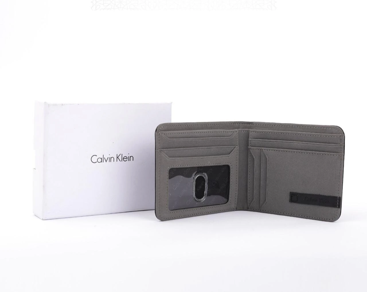 محفظة نقود ثنائية الطي من كالفن كلاين للرجال – بجلد أسود مصمم بشعار الماركة ورمادية من الداخل