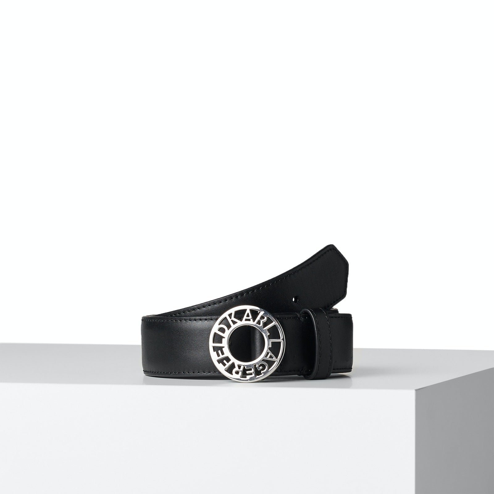 - Buckle: Prominent circular silver-tone metal buckle with intricate “KARL LAGERFELD” lettering cut out.